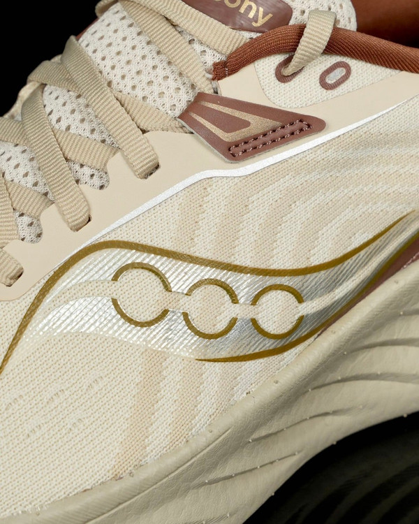 رویهی کفش از مش مهندسیشده با بافت متراکم ساخته شده که تهویهی مطلوبی را فراهم میکند و در عین حال، ساختار کفش را سبک و منعطف نگه میدارد. طراحی یقه و زبانه با بالشتکهای نرمتر نسبت به نسلهای قبلی، حس قفل شدن پا را بهبود بخشیده و راحتی را در ناحیهی مچ افزایش داده است. فرم کلی کفش با خطوط منحنی و لوگوی برجسته Saucony، ظاهری مدرن و پویا دارد.
