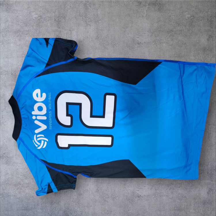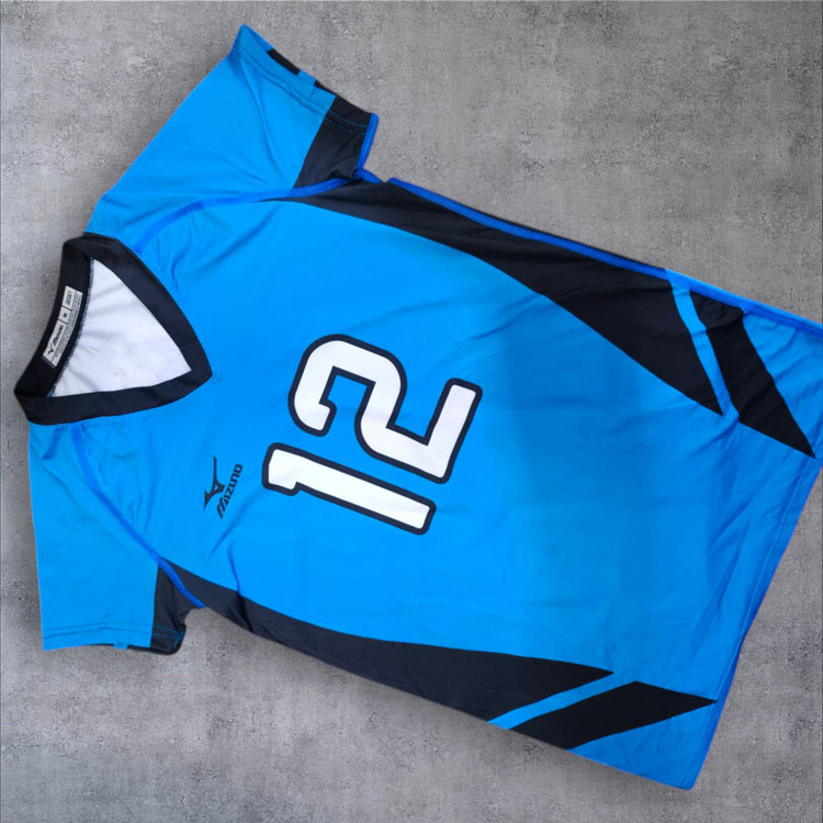 . طراحی آن شامل رنگ آبی با ترکیب مشکی و جزئیات هندسی است. شمارهی "12" در قسمت جلویی با فونتی برجسته و سفید مشخص شده است. این نوع تیشرت معمولاً در ورزشهایی مانند والیبال یا دو و میدانی استفاده میشود.